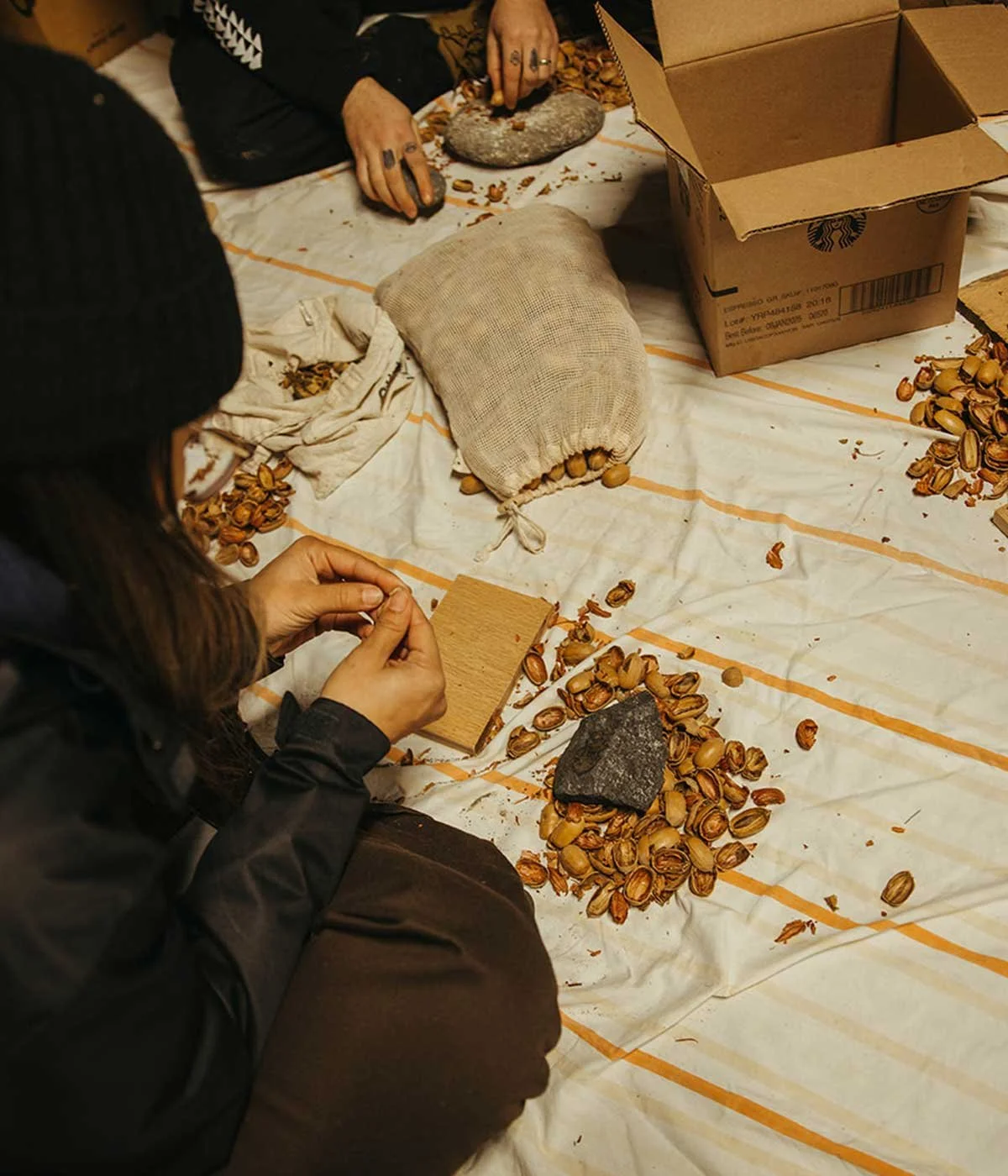 Attendees at the 2024 Indigenous Agroforestry Network Gathering cracking acorns to make traditional first food acorn soup, a staple for many tribes in Northern California. Daisy Autumn Photography
